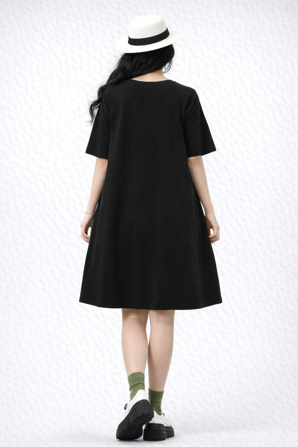 A chic and versatile black A-line dress crafted from a soft, breathable knit fabric. The dress features delicately embroidered cutwork floral motifs on the sleeves for a subtle feminine detail. Designed with a relaxed silhouette that gently flares out, offering comfort and effortless movement. The simple round neckline and clean finish make it perfect for casual outings, daywear, or pairing with accessories for a stylish on-the-go look.