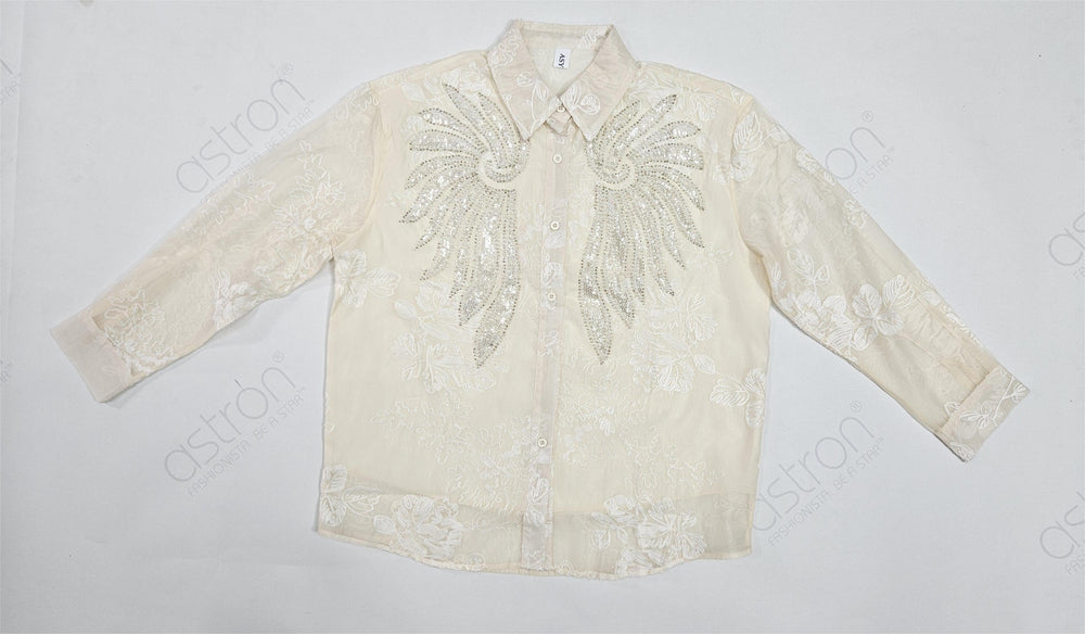 A beautifully designed beige embroidered shirt featuring intricate white floral embroidery and delicately placed pearl-style embellishments on the front. The shirt has full sleeves with buttoned cuffs, a classic collared neckline, and a button-down front. Crafted in a lightweight woven fabric with a semi-sheer look, ideal for festive wear, semi-formal occasions, or elegant everyday styling.