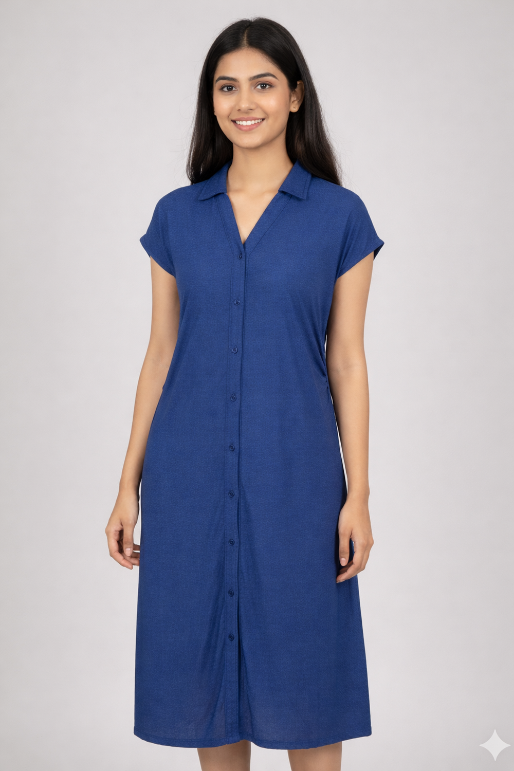 A simple and comfortable button-down midi dress in a rich blue shade. Designed with a soft knit fabric that drapes naturally, this dress features a V-neckline with a shirt collar for a clean, casual look. The front button placket adds versatility, while the cap sleeves provide a relaxed, easy-to-wear feel. Ideal for everyday wear, work-from-home looks, casual outings, and travel.