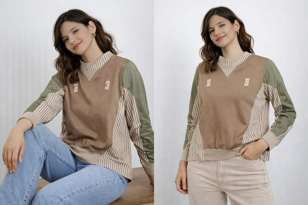 A unique and stylish color-block sweatshirt combining beige cotton knit fabric with olive sleeves and vertical striped woven panels. Features decorative button tabs on the chest and ribbed neck, cuffs, and hem for structure. The relaxed silhouette offers everyday comfort while the mixed fabrics give it a modern, patchwork-inspired look. Ideal for casual outings, weekend wear, or pairing with jeans for an effortless chic style.