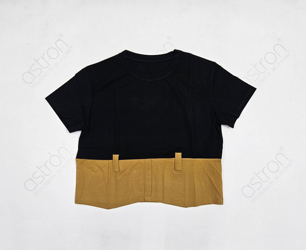 Women’s mustard Colo block T-shirt featuring a relaxed fit, short sleeves, and a classic round neckline. Made using soft knitted jersey fabric, it offers a stylish yet comfortable everyday look.