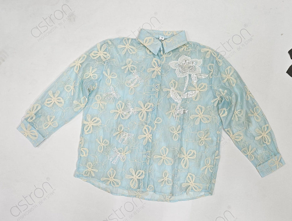 An exquisite white lace embroidered shirt crafted with intricate floral and geometric patterns. Featuring delicate 3D appliqué details, a scalloped hemline, and a classic collar, this piece offers a refined and sophisticated look. Its sheer lace construction adds a touch of luxury, making it perfect for elegant daywear, resort styling, festive occasions, or layering over camisoles for a chic, timeless appearance.