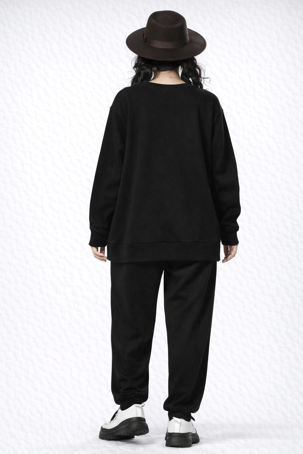 Women’s black jogger pants in soft fleece-knit fabric, featuring printed graphic details, a relaxed fit, and a comfortable full-length jogger silhouette suitable for casual or athleisure wear.