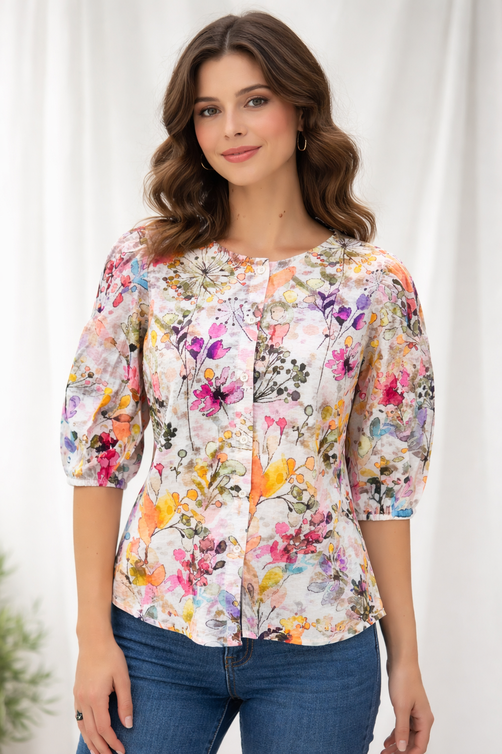 A vibrant multi color water color floral printed top featuring a round neckline and a button-down front. Designed with voluminous puff sleeves and a subtly flared hem, this stylish blouse combines femininity with comfort. Perfect for casual outings, brunch dates, or summer wear, offering a fresh and artistic look with its soft floral palette.