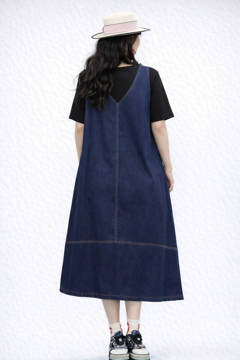 Women’s dark blue denim A-line button-down dress featuring a sleeveless design, V-neckline, and relaxed flared silhouette. Crafted from sturdy woven denim, this maxi dress offers a stylish, structured yet comfortable look—perfect for layering over tees or tops.