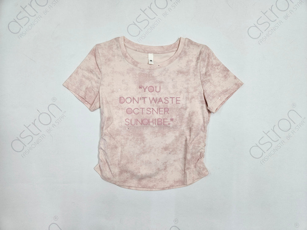 Stylish women’s casual blue T-shirt crafted from soft, breathable cotton fabric. Features an all-over blue and white tie-dye pattern with a trendy printed slogan on the front. Designed with a classic round neckline, short sleeves, and a comfortable regular fit, making it perfect for everyday wear and relaxed casual styling.