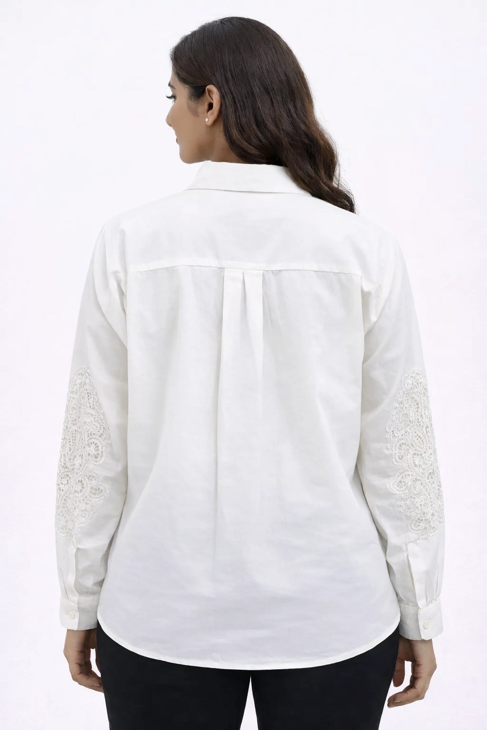 An elegant white embroidered shirt featuring intricate lace applique across the front yoke, shoulders, and sleeves. The beautiful lace pattern creates a refined, statement look while the lightweight woven fabric ensures comfort. Designed with a button-down front, full sleeves, and a classic shirt collar, making it perfect for festive occasions, formal wear, or classy everyday styling.