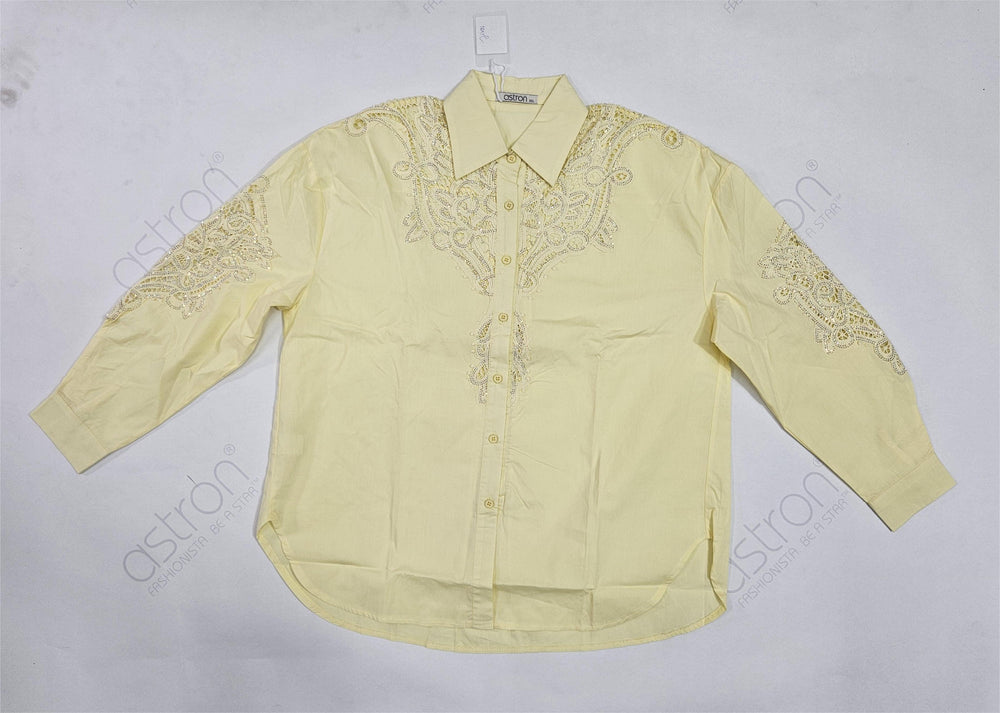 An elegant pastel yellow embroidered shirt featuring exquisite lace applique across the front yoke, shoulders, and sleeves. The detailed lace work adds a sophisticated, premium look, while the lightweight woven fabric ensures comfort throughout the day. Designed with a classic shirt collar, full button-down placket, and cuffed sleeves—perfect for festive wear, office outings, and refined casual styling.